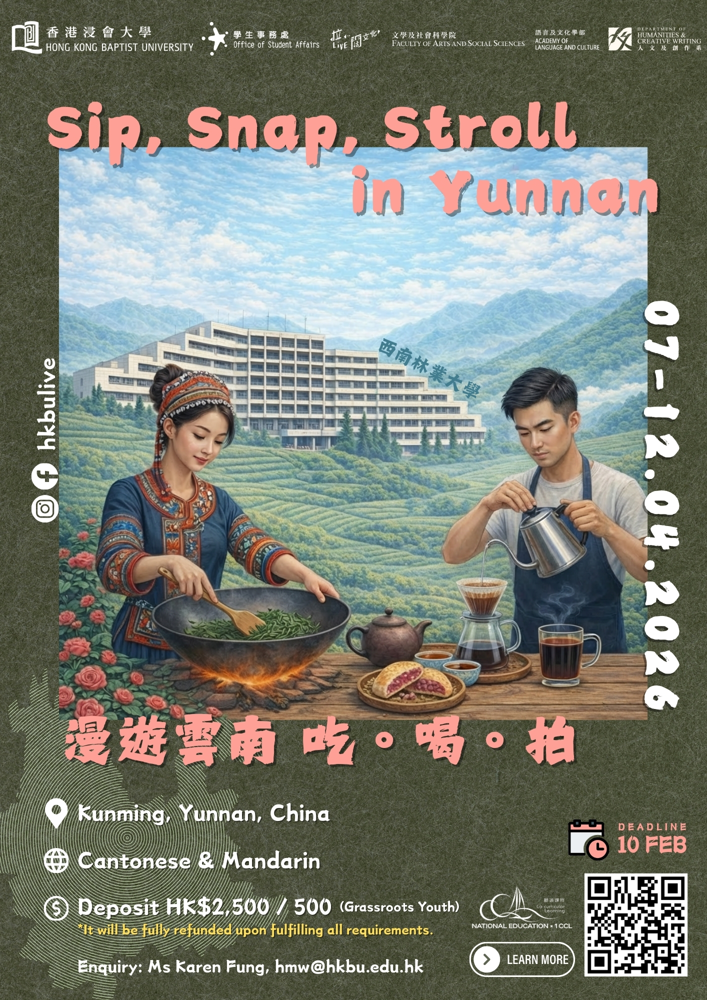 To use HKBU Event Calendar , please enable JavaScript in your browser settings, and then refresh this page. [CCL] Sip, Snap, Stroll in Yunnan